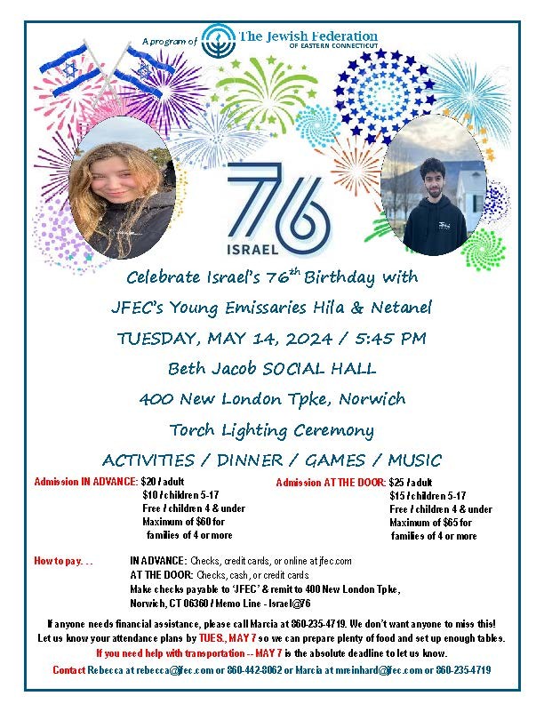 Make checks payable to 'JFEC' & remit to 400 New London Tpke, Norwich, CT 06360 / Memo line - Israel@76