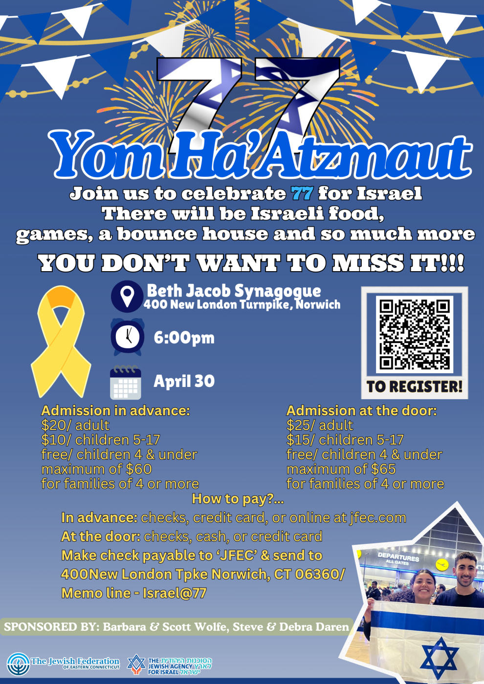 Make checks payable to 'JFEC' & remit to 400 New London Tpke, Norwich, CT 06360 / Memo line - Israel@77