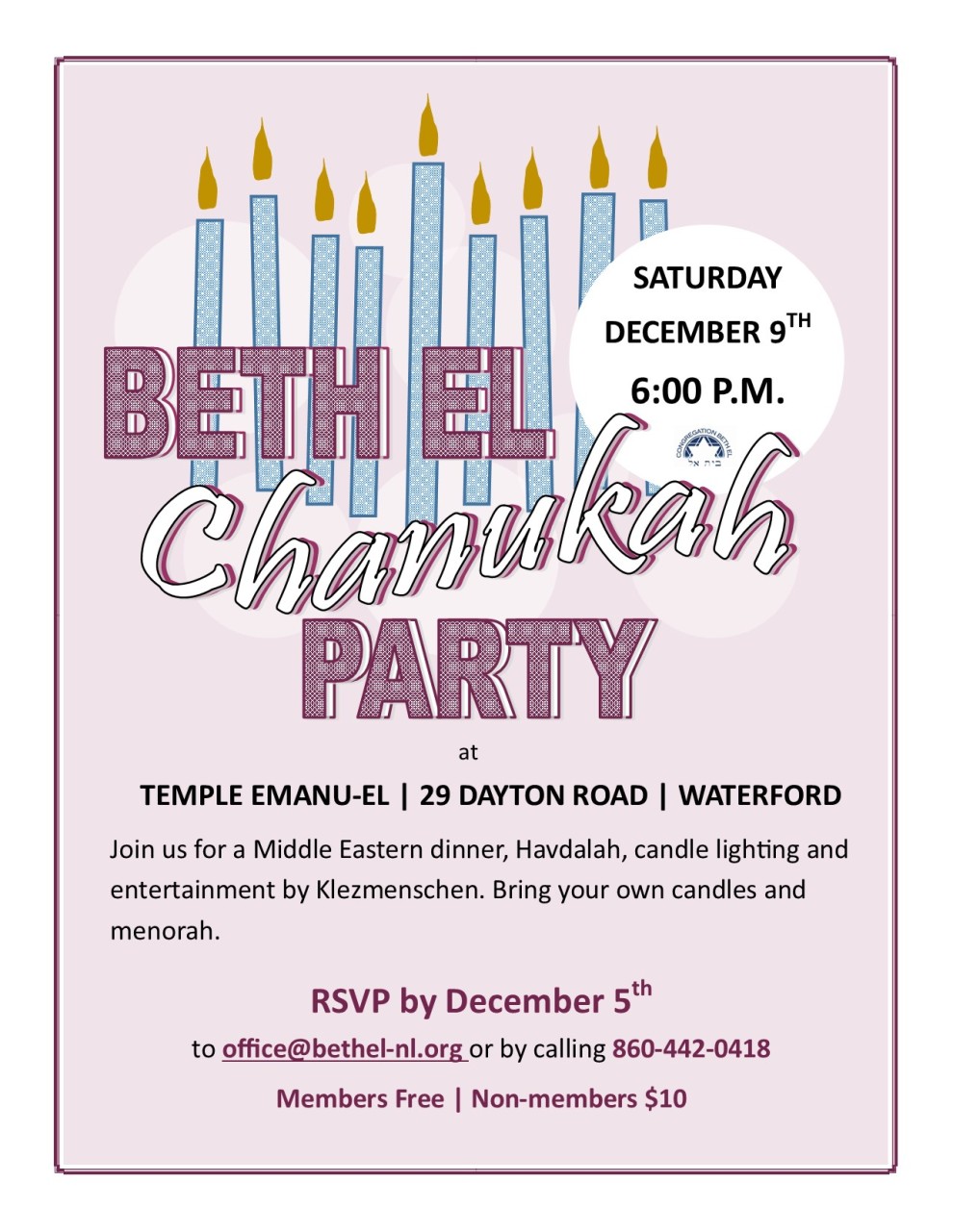 Congregation Beth El will celebrate Chanukah on Saturday, December 9th at 6:00 p.m. beginning with Havdalah and candle lighting, followed by a Middle Eastern dinner. Bring your menorah & candles! The event will be held in the social hall at Temple Emanu-El in Waterford. All are welcome to attend: Free for Beth El members, $10.00 for Non-members. Please contact the Beth El office to RSVP, (860) 442-0418.