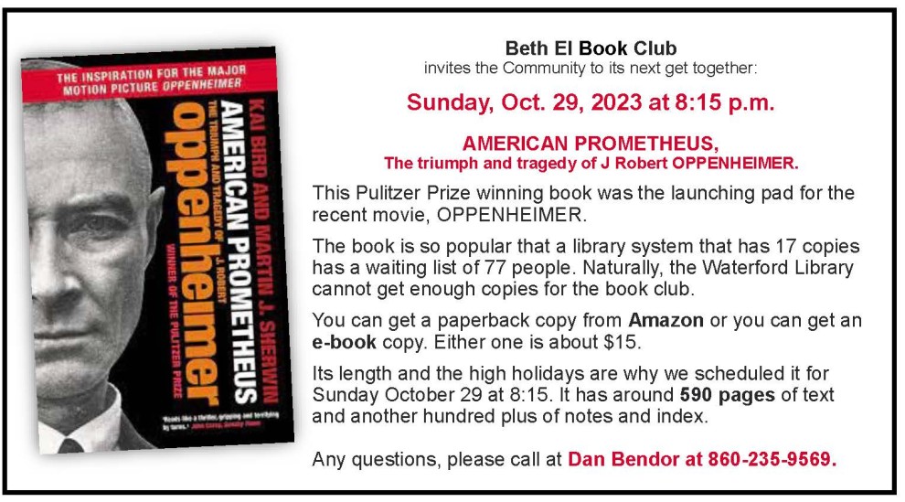 Join us for the next Book Club meeting, Sunday, October 29th at 8:15 p.m. via Zoom where we will discuss "AMERICAN PROMETHEUS" by Kai Bird and Martin J. Sherwin (The Inspiration for the Major Motion Picture “OPPENHEIMER”)