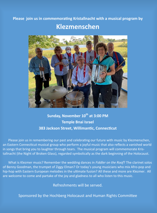 Please join us in remembering our past and celebrating our future with music by Klezmenschen, an Eastern Connecticut musical group who perform a joyful music that also reflects a vanished world in songs that bring you to laughter through tears. The musical program will commemorate Kristallnacht (the Night of Broken Glass), regarded symbolically as the dark beginning of the Holocaust.