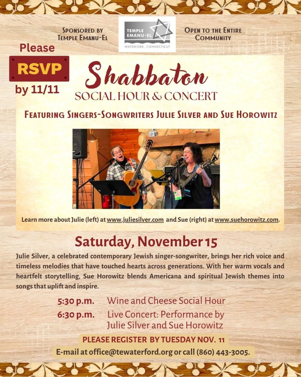 6:30pm - Live concert: Performance by Julie Silver and Sue Horowitz