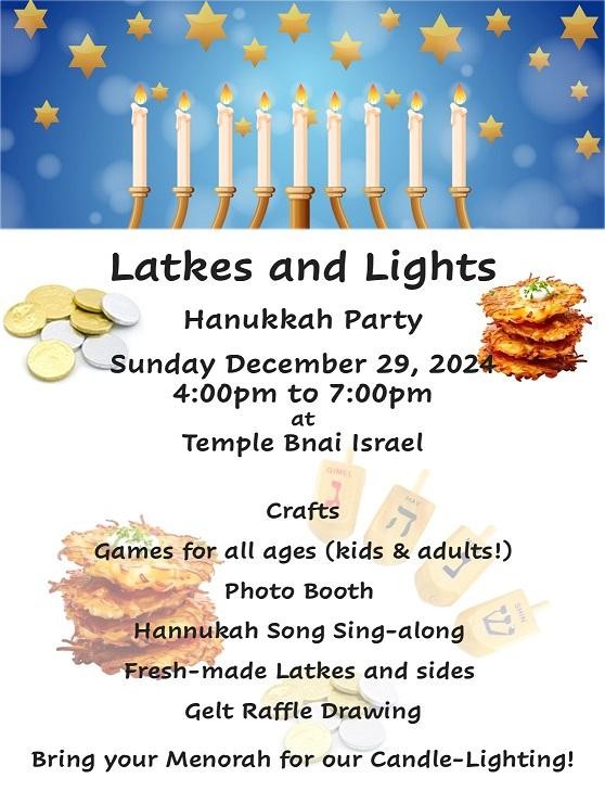 Join us for a Hanukkah party full of fun! We will have crafts, games for kids of all ages (including adults!), a Photo Booth and a sing a long for Hanukkah songs. We're serving up latkes with the fixings and salads. Don't forget to bring your menorah for the candle lighting! We'll also be pulling winners for our Hanukkah Gelt Raffle.
