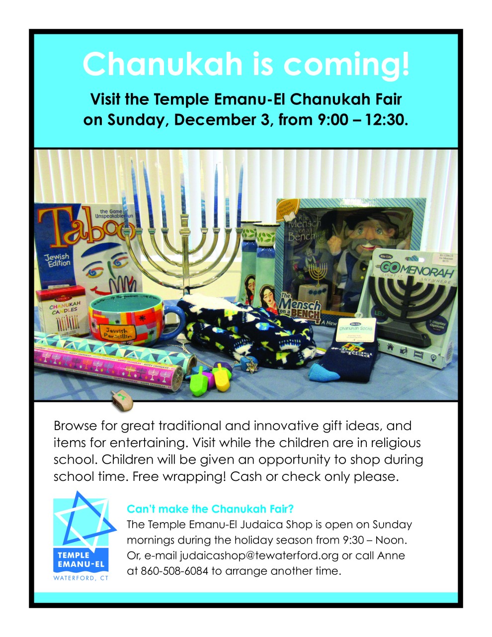 In need of Chanukah gifts? Come on out to the Temple Emanu-El Chanukah Fair! Lots of gift ideas for people of all ages. The Chanukah Fair is open to anyone and everyone!