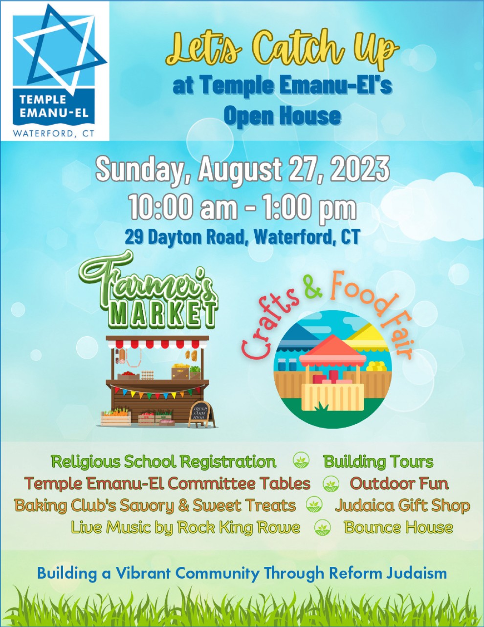 Have you heard? As summer winds down, Temple Emanu-El invites you to our first Open House Farmer's Market and Crafts & Food Fair on this Sunday, August 27 from 10:00 am-1:00 pm. Join in the outdoor fun for some end of season shopping for produce, crafts and food from local vendors including: Cam's Creations, Creative Turnings, K's Kart, Keller Scrapworks, Lee's Toy & Hobby, Quilt'N Creations, Jay's Taggy's, Rest in Beads, Sierra Whispers, Tastefully Simple, The Hoppiest Place, and White Gate Organic Farm, and more... Religious School Registrations will be accepted. The children will enjoy a bounce house and craft project. There will be building tours. Committees have some upcoming year previews to share, the Judaica Gift Shop will be open, and Baking Club will feature savory and sweet delights. Live music by Rock King Rowe!