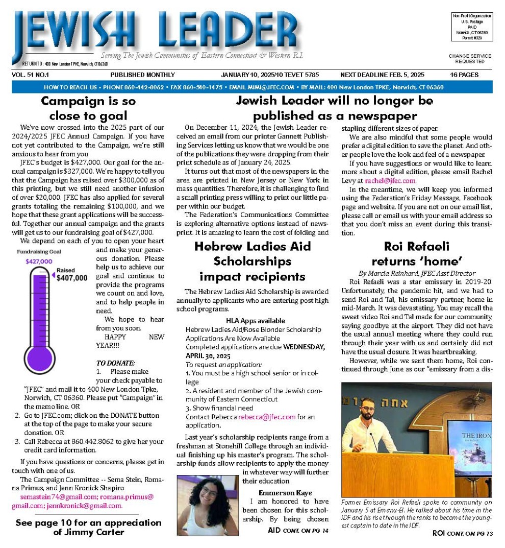 Therefore, we are counting on you to show how grateful you are for the Jewish Leader by making a donation to the Leader when you receive your Annual Appeal letter in the mail. These donations will help us to continue printing and delivering your paper each month or visit our website at www.jfec.com and choose the Leader in the drop down menu to give.